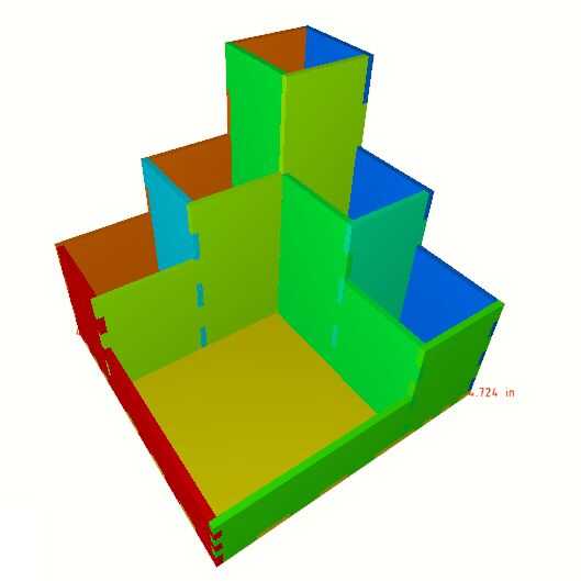 El STL exportados de Alibre abrió sus puertas en el 123D hacen escuchar. La versión beta particular tuve acceso a tiene un algoritmo que le permite encender una cáscara de una caja en rodajas con lengüetas y ranuras que se acoplarán entre sí. Agrega automáticamente las articulaciones del dedo, permitiendo elegir cantidad y espesor del material.