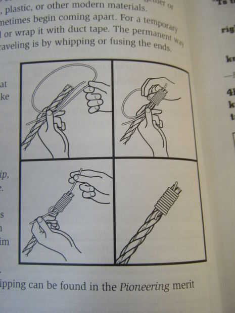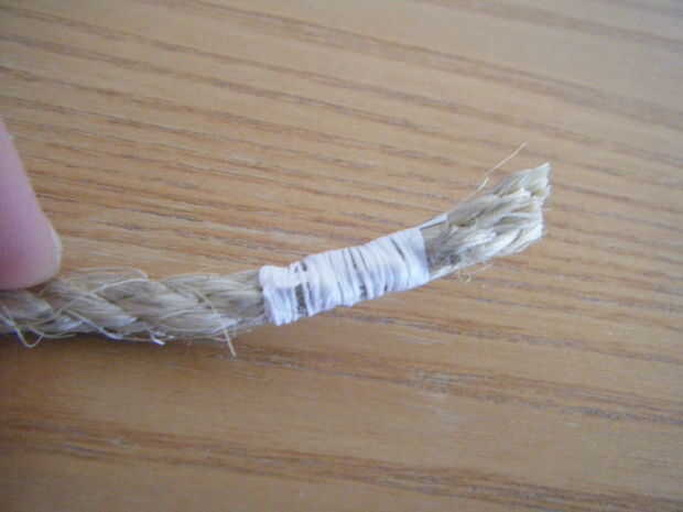 "Corte de la cuerda que ya había desentrañando. Tome un pedazo de cuerda fuerte, preferiblemente encerado y al menos 2 pies de largo y forma un lazo cerca del extremo de la misma. Coloque el lazo cerca del extremo de la cuerda. Bien envolver o látigo, la cuerda alrededor de la cuerda. Cuando los azotes es al menos tan amplio como la cuerda es gruesa, el extremo a través del lazo y tire fuerte. Recorte el exceso de cordel, luego batir las cuerdas otro extremo".