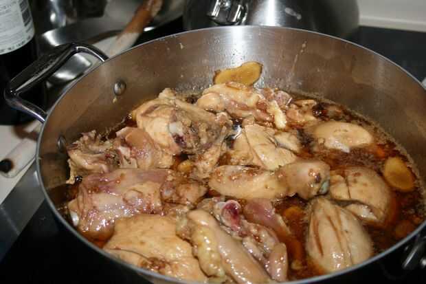En una olla grande, añadir la salsa de soja, agua, azúcar, sake, aceite de sésamo, ajo, jengibre y ajonjolí. Fuego lento, lentamente revuelva el líquido parrillas inclinables hasta que el azúcar se haya derretido y llevar la mezcla a fuego lento bajo. Una vez que el líquido parrillas inclinables es cocer a fuego lento, añadir todas las piezas de pollo a la vez. Todas las piezas se mezclan con el líquido parrillas inclinables y luego cubrir y reducir el calor a medio bajo. Desea mantener bajo constante fuego lento. (unas burbujas subiendo a la superficie pero no un infierno rabiando de burbujas) Cocinar a fuego lento durante 30 minutos.