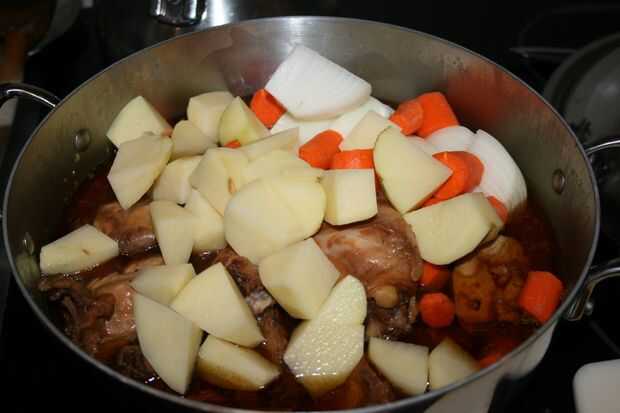 Compruebe el bote después de 30 minutos. Revuelva el pollo. Agregar papas, zanahorias y cebollas y revolver cuidadosamente asegurándose de que las verduras están bien sumergidas en el líquido parrillas inclinables. Cubierta. Continuar la cocción durante otros 20 minutos, o hasta que las verduras estén tiernas. Servir con arroz y no sea tímido acerca de tomar la cocedura líquido y verter sobre el arroz.