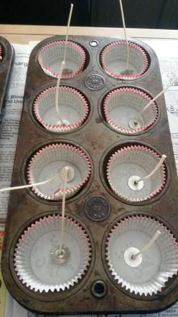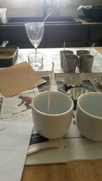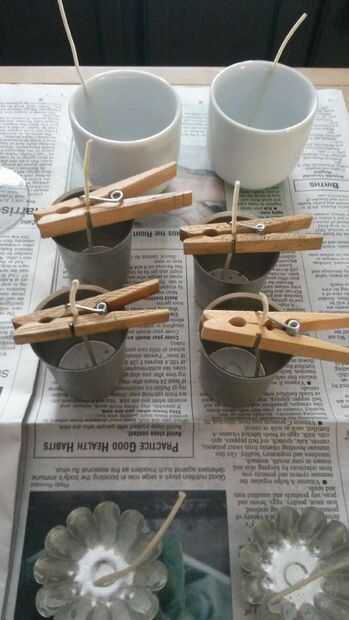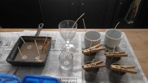 a continuación, utilizar palos de mecha (adhesivos redondos pequeños que son adhesivas por ambos lados) y colocarlos en la parte inferior de mis artículos de vidrio para que la mecha se permanece en el lugar una vez añadir la cera de la soja. Yo también uso lápices y lavandería pernos para fijar las mechas.