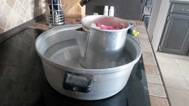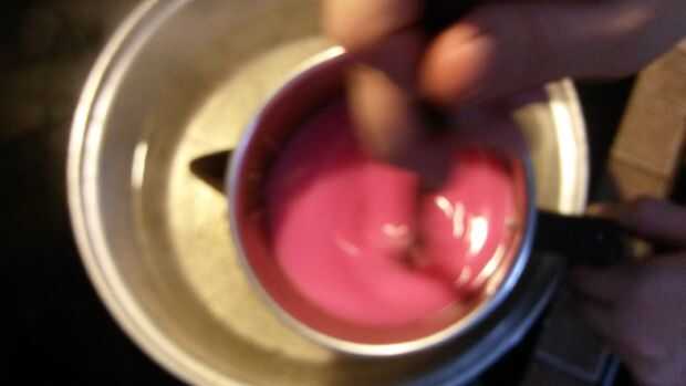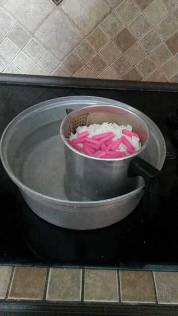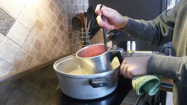 Al derretir los copos de soja utilizar un método de doble caldera. Tengo una olla vieja y un viejo pote de café. Coloque la olla a fuego medio y revuelva hasta que se derritan.