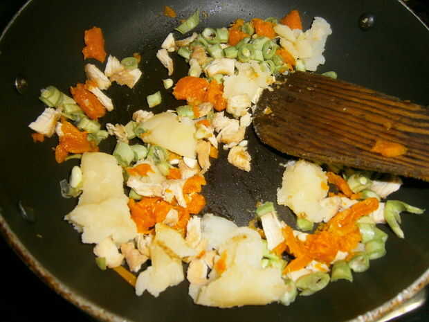 Añadir jengibre ajo pasta y saltear para en algún momento hasta que sale el olor a crudo.
