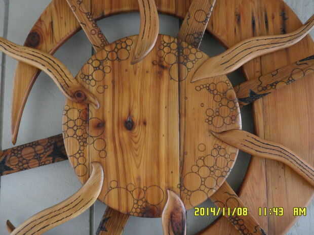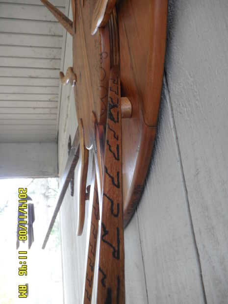 Así que inclinados vigas rectas entre el sol la luna n P-1, había izquierda sobre un labio de 7/8 de pulgada a rosca insertos de latón P-2 y cortar en cuñas P-3,4 (usando un complicadas fórmulas matemáticas) para apoyarlos en el Luna creciente cuña. El efecto 3D es excelente! (O.K., sólo describen, corte, lija para caber).