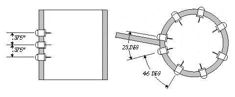 Diseño de la posición de todos los agujeros de LED en la carcasa del sensor según el diagrama de abajo. Habrá ocho filas con tres LEDs en cada uno. Cuatro filas de LEDs se conectan en paralelo y conectan el circuito de impulsión del motor de este o el circuito de impulsión del motor del oeste. Sacador de centro y taladro el 24 LED en el sensor de vivienda asegurándose de que cada agujero es perforado perpendicular al eje de la caja de sensor y que cada sistema de tres agujeros son alinean paralelo al eje de la caja de sensor. Cada fila está espaciada 43 grados aparte y cada LED es espaciadas. 375" en cada fila. Los LEDs de este y del oeste están separados por 23 grados utilice una broca de tamaño adecuado que permitirá a cada conductor a ser presionado firmemente en lugar. Simplemente puede perforar algunos agujeros de prueba en un retal de ABS para encontrar el diámetro de broca adecuada.