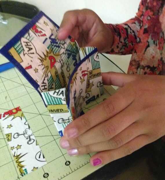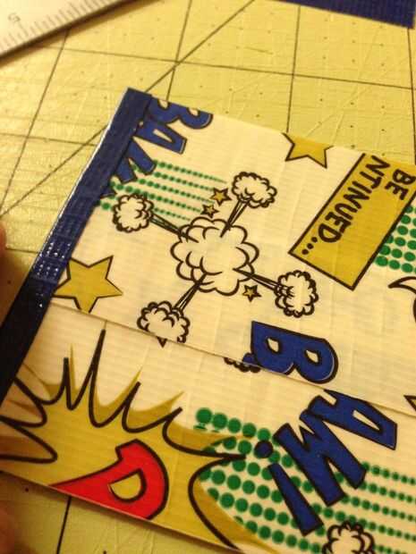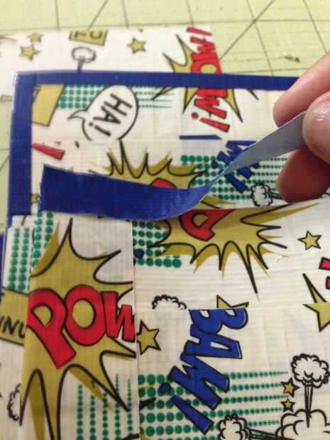 Cortar 5 trozos de cinta de pato en color conexión 1/4" de ancho por 5,1" en longitud. Colocar en la parte superior y los dos lados de la tapa, doblar los bordes para asegurar su lugar. Luego colocar los otros dos en la parte superior de las dos piezas de base existentes.