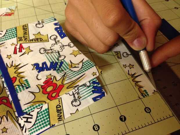 Cortar una sola pieza de pato cinta 5,1" largo x 1" de ancho. Encontrar la anchura del centro de la cinta pato y manténgalo en medio estilo perrito caliente. Colocar en la parte inferior abierta del monedero. Adherir esta pieza cortada de la cinta de pato a la parte inferior y los bordes de la cartera al cierre de nuevo.