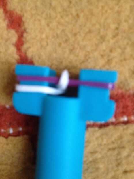 esto es una pulsera de nivel intermediaria, se puede hacer muy fácilmente.Fuentes: 3 colores de bandas en telar, telar del arco iris y un gancho.Paso 1: Empezar por colocar dos bandas blancas en forma de 'v' en el inicio del telar.Paso 2: El lugar un