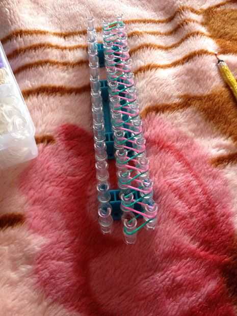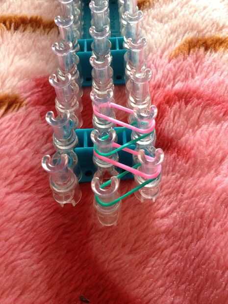 esto es una pulsera de nivel intermediaria, se puede hacer muy fácilmente.Fuentes: 3 colores de bandas en telar, telar del arco iris y un gancho.Paso 1: Empezar por colocar dos bandas blancas en forma de 'v' en el inicio del telar.Paso 2: El lugar un