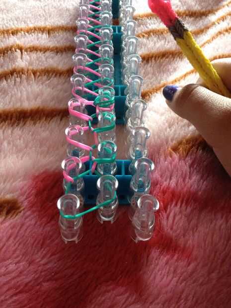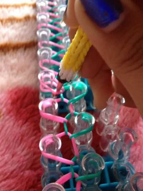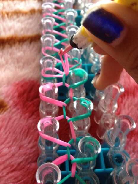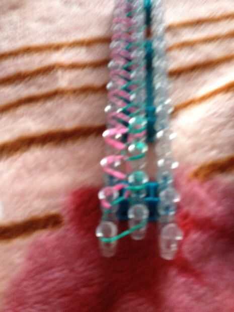 esto es una pulsera de nivel intermediaria, se puede hacer muy fácilmente.Fuentes: 3 colores de bandas en telar, telar del arco iris y un gancho.Paso 1: Empezar por colocar dos bandas blancas en forma de 'v' en el inicio del telar.Paso 2: El lugar un