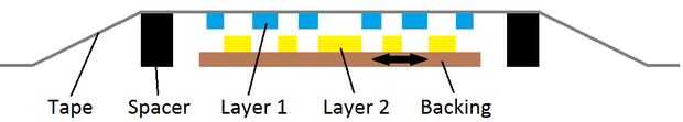 El truco para el revestimiento es bien suspender la hoja adhesiva del claro de la primera serie de piezas de vinilo color, encima de un tablero de respaldo que contiene el segundo sistema. Esto permite muy preciso y cuidadoso alineando antes de la segunda capa es recogida por el adhesivo transparente.