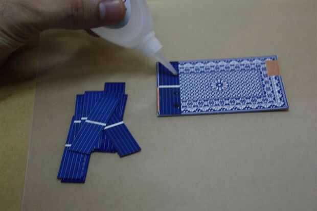 Este paso es la clave: combinar solettes en serie con una técnica shingling superglued. Salidas de cada solette o cualquier pedazo de mono o policristalino silicio PV de hecho, alrededor de 0, 5 - 0.6VDC, que no es suficiente voltaje para hacer muchas cosas útiles. Así que, tenemos bastantes de estos solettes combinan en serie para que suman sus salidas de voltaje.