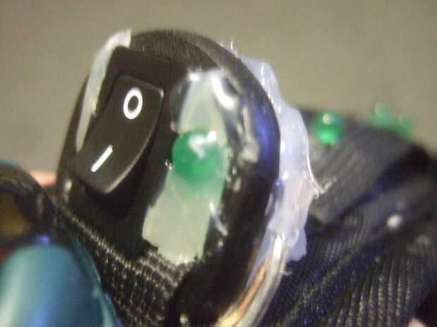 Así en el interés de ahorro de energía, inserta un interruptor SPST en un anillo de plástico que pasó a ser de la correa. También había incrustado la recarga solar y estado de carga-uso LEDs a cada lado del interruptor, luego cubrió la totalidad del lote con otro gob de pegamento caliente.