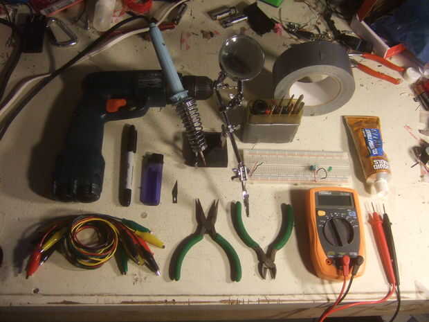 Tuve una mochila barata de Burton Snowboards, que era el tamaño perfecto para mis propósitos, pero no le gustaba el estilo recto "mochila". Así que cambiado las correas y ahora su estado inclinado a su lado como una bolsa de mensajero con una correa de cuerpo principal-hugger y una correa auxiliar que la oiga de la parte inferior, proporciona una plataforma muy segura. El mayor inconveniente hasta ahora es cómo tiende a envolver el cuerpo, resultando en una camisa completamente empapado de sudor. Pero, EH, cualquiera que sea. Trabaja. He encontrado un envase de tupperware-tipo enganche, hermético en la cocina que era perfecta para el proyecto y el faro, escogido para algo así como $6 de WalMart. Prácticamente todo lo demás estaba en mi caja de cambios o pedir en línea. La mayoría de mi cableado es un manojo de cables de altavoz que tenía por ahí, bonito y resistente.