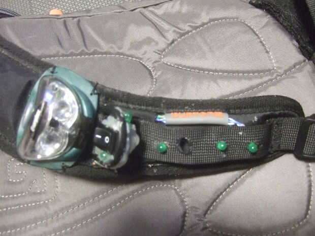 A continuación, taladre los agujeros en las esquinas de la carcasa del faro si es posible y coserlas a la correa, pero de una manera que no impide otros cables atravesando, si lo que desea.