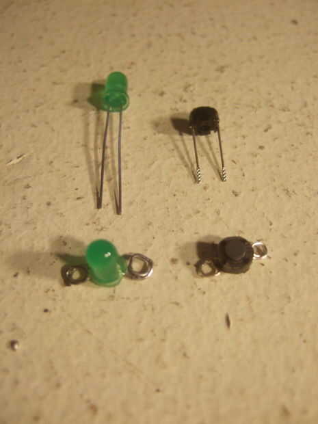 Para empezar, enrollamiento de los cables de ambos elementos. Es importante mantener la distinción entre el ánodo y el cátodo (+ y-, largo y corto) en el LED, así que asegúrese de aplicar estilos diferentes que se encrespa a cada pata del LED. He utilizado square-ish por el lado positivo y más circle-ish para la negativa. Pero es difícil decir la diferencia a veces, por lo que podría cambiar a usar círculos y triángulos en el futuro. Lo que tu Convenio, asegúrese de que adhieren a ella!