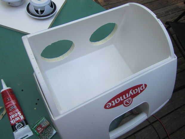 Una vez que los agujeros se cortan, pop los oradores y atornillar los 4 tornillos para cada altavoz. Taladre agujeros piloto y ajustar los tornillos a mano, como la espuma es muy suave y que sería fácil tira lejos con un taladro. Aplique una tira de sellador alrededor del borde de cada altavoz para terminar, lo que es más resistente al agua.