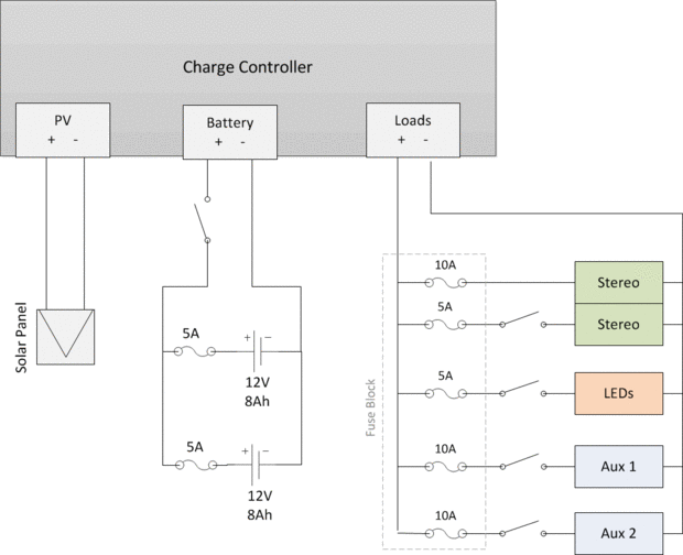 Hay básicamente 3 diferentes circuitos de cargas (1) y (2) baterías (3) paneles solares. Para cada uno de ellos, que va a conectar todo en paralelo con el controlador de carga, que aísla cada circuito de los otros. DEBE tener un fusible dedicado instalado en serie con la batería. Para las cargas, en lugar de tener fusibles individuales para cada carga (como se muestra), usted podría también bulto esto en un solo fusible para todas las cargas. Aparte de eso, la teoría de es bastante simple.