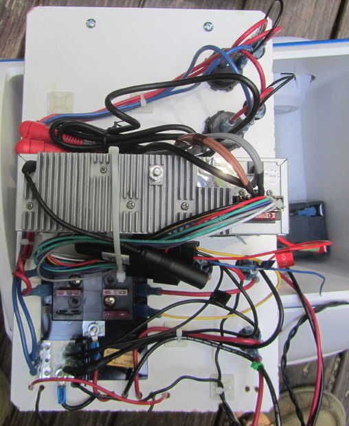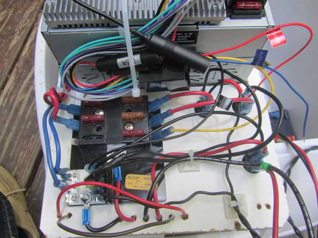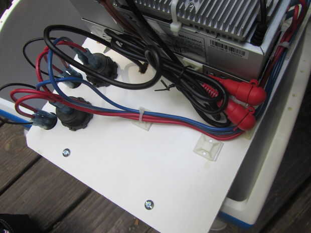 Sin embargo, en la práctica es difícil mantener todo organizado y atado con alambre correctamente. Como se puede ver, puede rápidamente llegar a ser un nido de ratas mezclado. Me gusta usando conectores crimp, y son bastante comunes entre los dispositivos de auto marina 12V. Te recomiendo un montón de ataduras de cremallera y almohadillas adhesivas, o lo que adapte a sus preferencias.