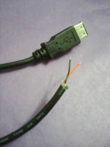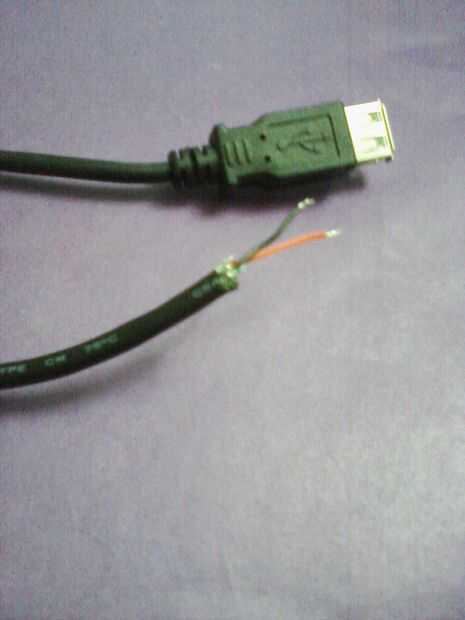 Para preparar el conector hembra USB-A, es necesario utilizar el USB-A hembra a USB-A macho cable y corte 1 pie de cable desde el conector hembra USB A. A continuación, quitar el plástico negro y el resto de material que cubre los cuatro cables en el cable, cortando los cables blancos y verdes, dejando el rojo y el negro sólo para ser utilizados.