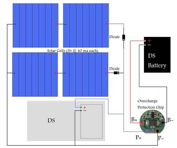 Otra cosa que quiero mencionar es por qué no usar un regulador de 5v y conectarlo a la toma de carga de la DS. La razón que no hago eso es porque tendría que cablear las células solares para producir un voltaje más alto para el regulador de tensión. Esto me daría a menos de 40 ma. Corriendo a través de un voltaje regulador reduce aún más. Además, el DS tendría su LED de carga en si lo hice. Aspiraría a cerca de la mitad de la corriente restante, dejando casi nada para la batería. Si lo hice de esa manera, se carga de la batería aproximadamente 4 veces más lento.