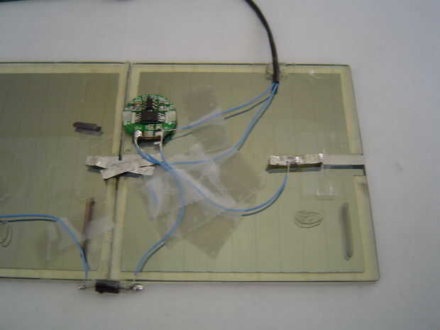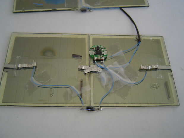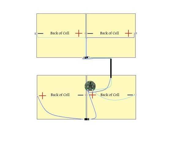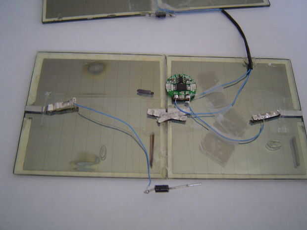 Cortar otro cable corto y tira de ambos extremos. Soldar un extremo al extremo positivo del panel inferior. Suelde el otro extremo al ánodo de un diodo (ánodo es el extremo sin la línea blanca). Pegamento del diodo en el panel inferior en el lugar que se muestra en la imagen, luego poner algunos de la cinta sobre él. Una más corta alambre de corte y desforre ambos extremos. Soldar un extremo al cátodo del diodo (el cátodo es el extremo con la línea blanca) y el otro extremo a P + en el chip.