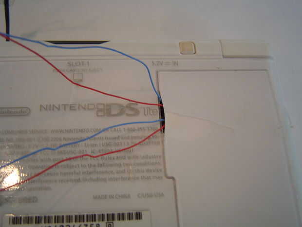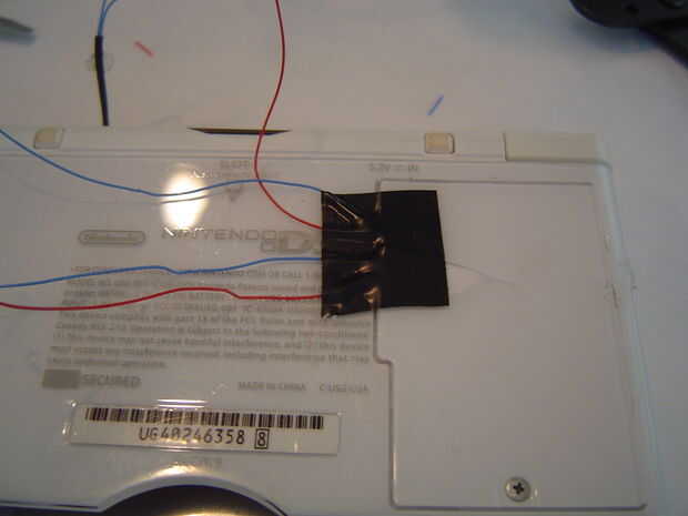 Una vez que, vuelva a enroscar la tapa de la batería el DS. Los cuatro cables deben encajar muy bien a través de la ranura creada. Ponga un trozo de cinta aislante sobre él para mantener los cables en su lugar. Ponga un trozo de cinta sobre uno de los cables de la batería para evitar cortocircuitos.