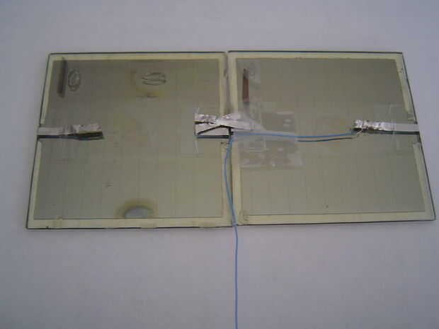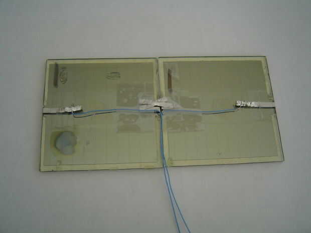 Elegir uno de los paneles que acaba de hacer, se trata del panel superior. Corte una longitud de alambre un poco más de 10 cm de largo y los extremos de la tira. La soldadura de uno de los extremos al final positivo (sin línea negra) del panel. Correr a la mitad del panel, cinta adhesiva y dóblelo hacia abajo. Hacer lo mismo con el extremo negativo con un cable de unos 20 cm de largo.