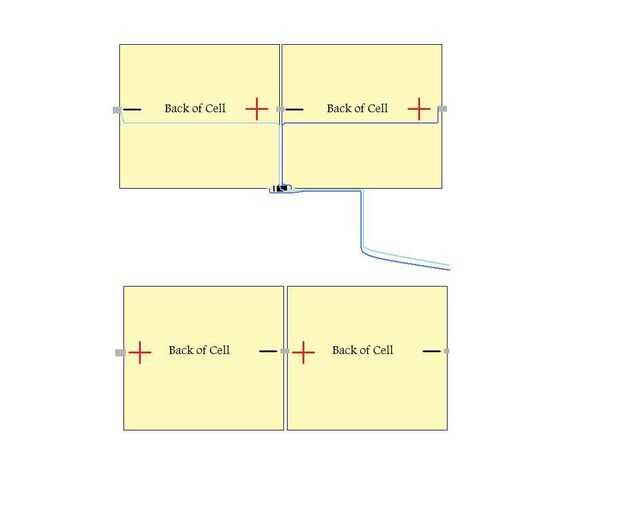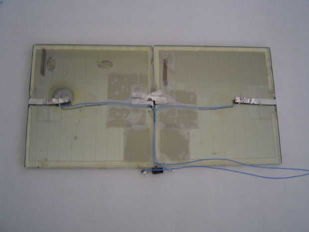 Un extremo de un cable de por lo menos 10 cm de largo de la soldadura y la soldadura de un extremo al extremo negativo del diodo (la una con la raya blanca). Doblar a la derecha, junto con el otro cable desde el panel. Cinta en el centro de la celda derecha y dobla hacia abajo. Poner alguna cinta sobre el diodo, también. Esto ayuda a mantener en su lugar.