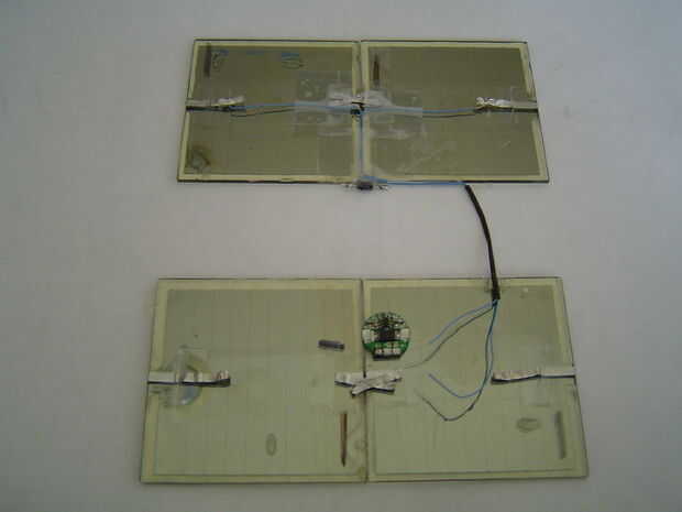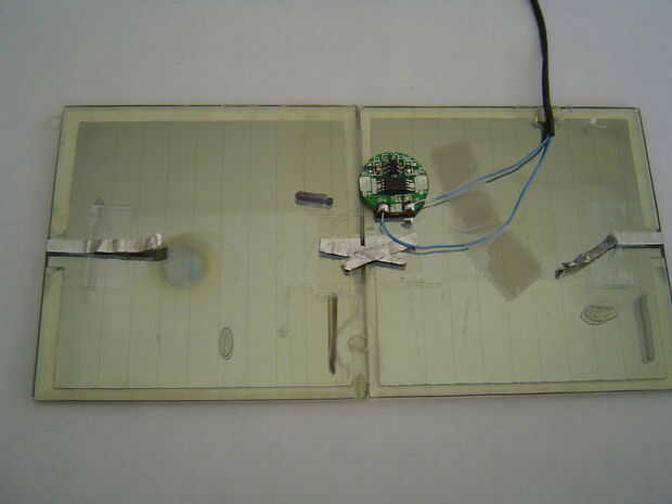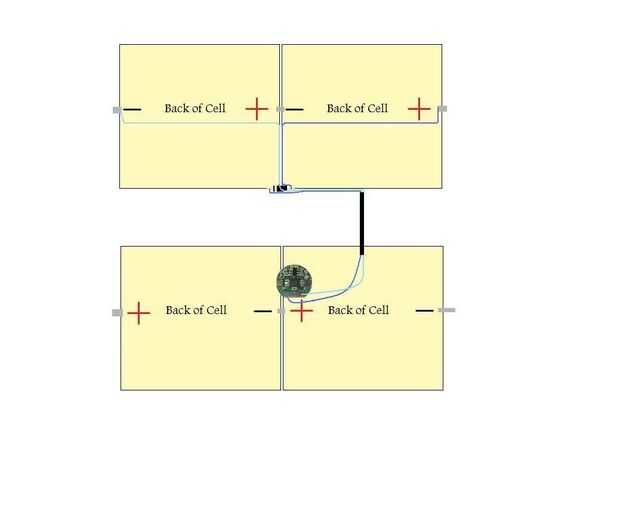 Tome su ficha de protección de sobrecarga y pegar la parte inferior para el panel inferior como se muestra en la imagen (no tarda mucho pegamento). Solde el cable positivo desde el panel superior al terminal de P + en el chip. Suelde el cable negativo desde el panel superior al P-terminal en el chip. Si no sabes cual cable es cual, utilice un multímetro. Los cables hasta el panel de la cinta.