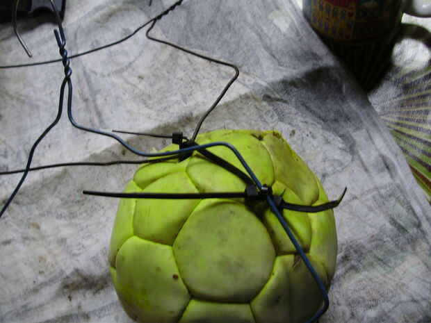 La cabeza es asustadiza pero necesita algún tipo de cuerpo. Me fijo los extremos de dos perchas de alambre en la parte posterior de la cabeza, con zipties y había grabado juntos los otros extremos de las perchas. Yo envueltos una bolsa de plástico sobre la parte superior por lo que sería la aleta en la brisa y ver vagamente animado.