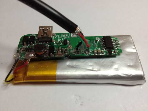 Entonces, había soldado el cable USB y batería lleva a la placa de circuito y añadido un poco de pegamento caliente para las conexiones. También caliente pegué la batería sí mismo a la parte inferior de la placa de circuito para mantener los dos asegurados juntos.