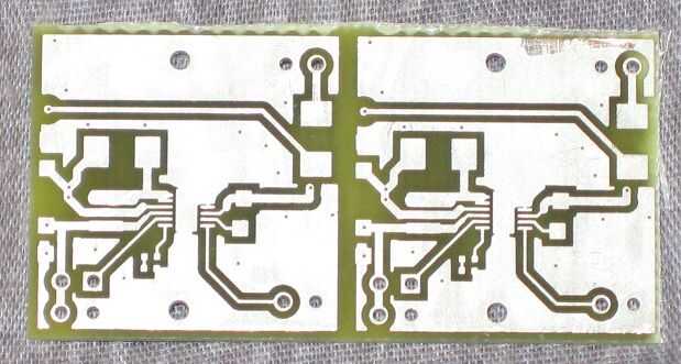 Aquí se muestra dos PCB antes de que dremel'ed ellos aparte. Este es el lado del circuito de la Junta, realmente acaba apuntando hacia abajo cuando la luz está en uso. Los tableros son cuadrados de 1" y mirar un poco extraños porque son tablas de"bare bones", que no tienen una capa de máscara de soldadura (la materia verde que ves sobre los PCB más). Esto hace montaje un poco más difícil ya que puentes de soldadura están mucho más probables que ocurra, pero los tableros son más baratos de esta forma y es una tabla muy simple. Un poco de cuidado en Asamblea asegura que no habrá ningún problema.