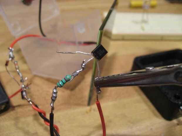 Tomar una (no importa) y soldadura de la resistencia de 1.000 ohmios. Luego suelde el otro extremo de la resistencia a la pata del media de su transistor de NPN.