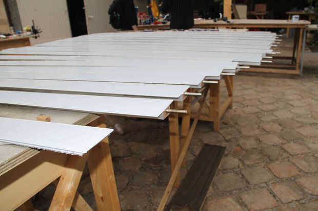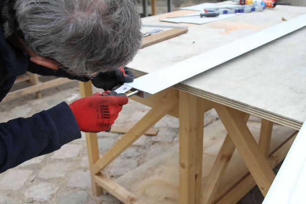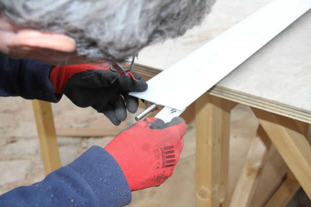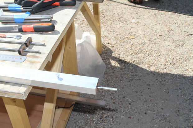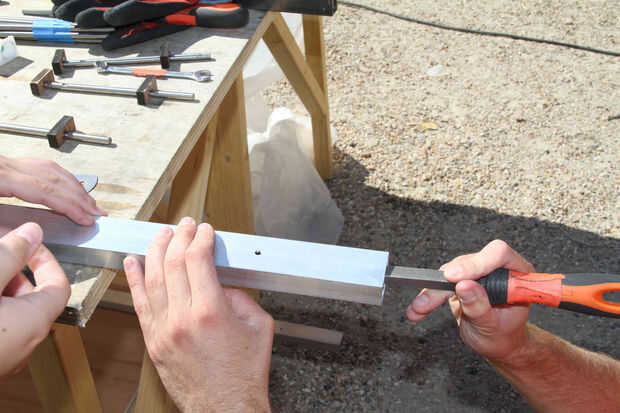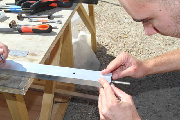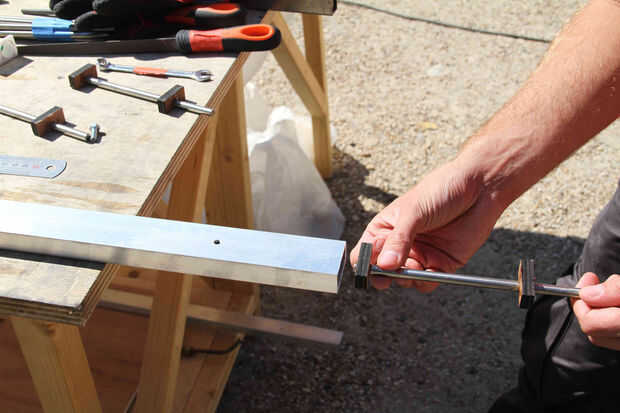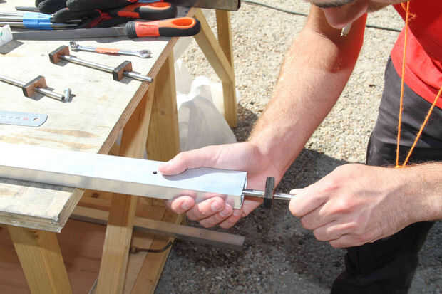 Inserte las barras con las bodegas sobre ellos en los tubos de aluminio. La barra debe ser tangente en el lado opuesto al orificio perforado. De esta manera, el plat punto es delante del orificio. Gire el tornillo en el agujero hasta que fija la barra en el plat spot. La barra se fija lateralmente con las bodegas y se fija en altura en toda su longitud con el tornillo.
