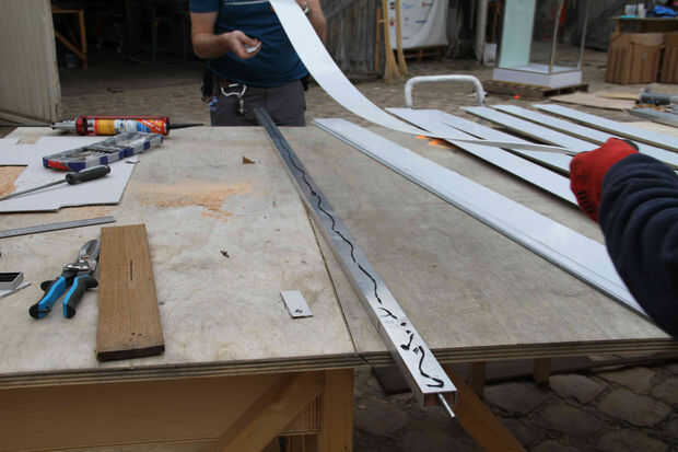 Pegue las facetas espejo rectangular en los tubos de aluminio. Asegúrese de que estén centradas en el ancho de los tubos.