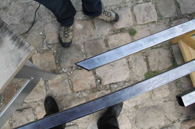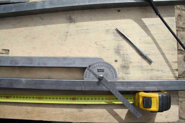 Taladre los orificios según el modelo 3D para montar las piernas de "tipi" (tubo de orificio 1/plaza), fijación del receptor (tubo de 1 agujero cuadrado), la fijación del tubo cuadrado inferior a lo largo (tubo de 2 orificios/Plaza), la fijación de la transversal plana (1 agujero / tubo cuadrado, 800 mm de la parte inferior, medido en el punto más alejado del corte de 45 °). Compruebe la longitud total del tubo cuadrado: se mide la longitud necesaria para perforar los agujeros de la parte inferior de la pierna.