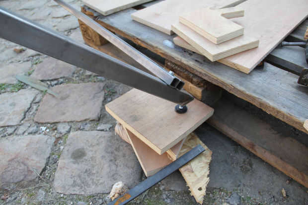 Corte 4 pisos con 30 mm grande, 40 mm de largo y 5 mm de grosor y verificar las dimensiones. Taladro y del golpecito los pisos a 10 mm de los bordes para fijar una pierna ajustable hechos de un tornillo con un diámetro de 8 mm de soldadura los planos en los bordes de corte a 45°. Haciendo esto, se obtiene una pierna horizontal ajustable.