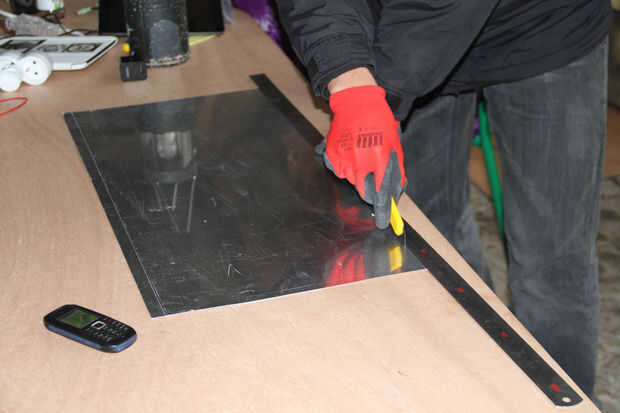 Con el cortador, trazar las líneas plegables siguiendo el plan de abajo. Ejecute la herramienta de corte para marcar las líneas sin ir a través y fragilizing el metal.