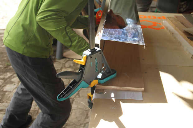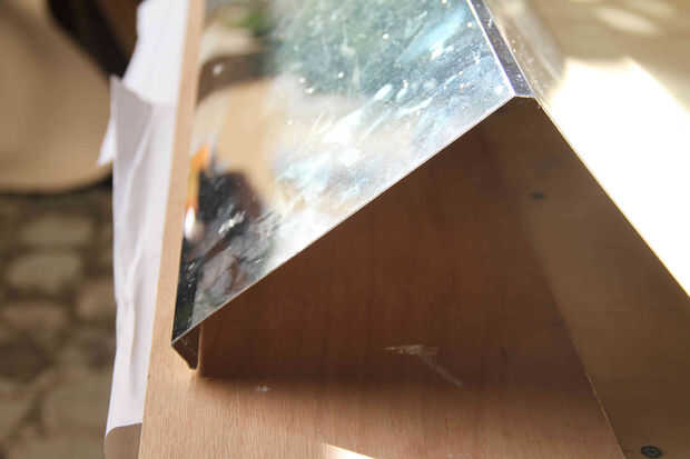 Elija una tabla rígida que no dobla y tiene un ángulo recto. Comience con un pliegue en la línea central. Poner la hoja del espejo con la parte reflectante en la parte trasera, para poder ver fácilmente los guiones marcados en la hoja. Doble tras el primer doblez aparente (el pliegue central en segundo lugar está marcado en el tablero de soporte). Proteger el espejo con la hoja de papel. Mantenga firmemente la hoja espejo debajo de la tabla con una abrazadera en cada extremo. Elija un tablero rígido, con un borde en ángulo recto y una longitud mayor que la hoja del espejo; Compruebe que la Junta está contra el borde de la mesa. Pulse debajo para obtener un doblez de la hoja de espejo entre 20 y 30 ° (aproximadamente la mitad de 45°). La presión debe ser uniforme en toda la superficie, con el fin de asegurar un doble regular.