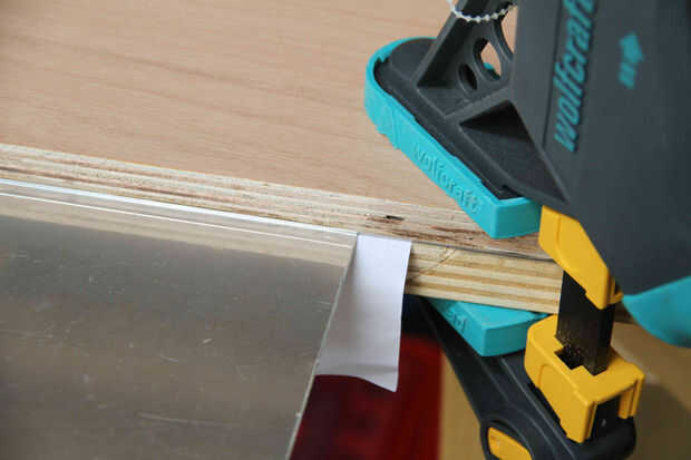 Aplicar dos veces el mismo método para cada uno de los pliegues laterales: fijar firmemente la hoja de espejo en una banda lateral de 15 mm. Esto permite un mejor agarre al doblar la hoja del espejo. Impone un ángulo de 90°. Presionar contra la línea discontinua.