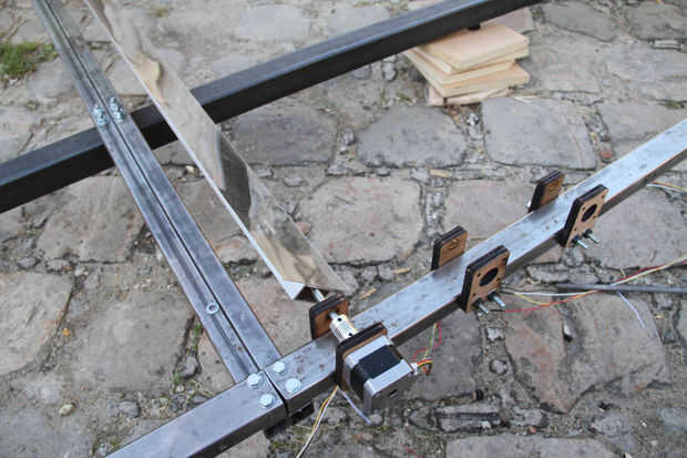 Fijar con 2 tornillos las piezas de soporte de madera para el motor en el tubo, parte exterior y la madera soporte piezas para los ejes del espejo como se indica en la vista 3D. El motor y el eje del espejo se fijan debajo del tubo, por lo que deben superar sus piezas de soporte de madera sobre.