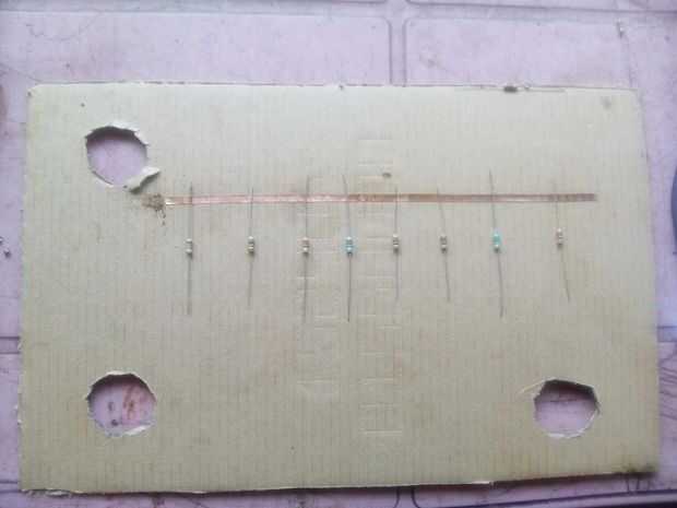 Tener resistencias (220e, 330e, 975, 470e, 10e, 15e, 47e, 39e) y ponerlo en orden sabio y tomar la cinta de cobre y fíjela como se muestra en la imagen.