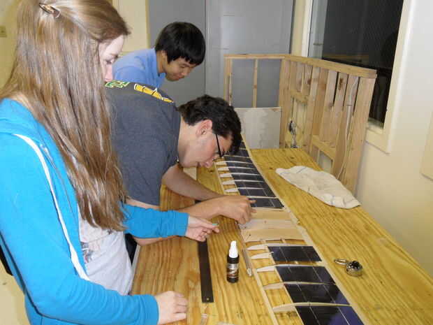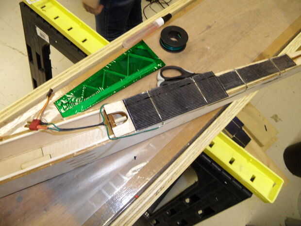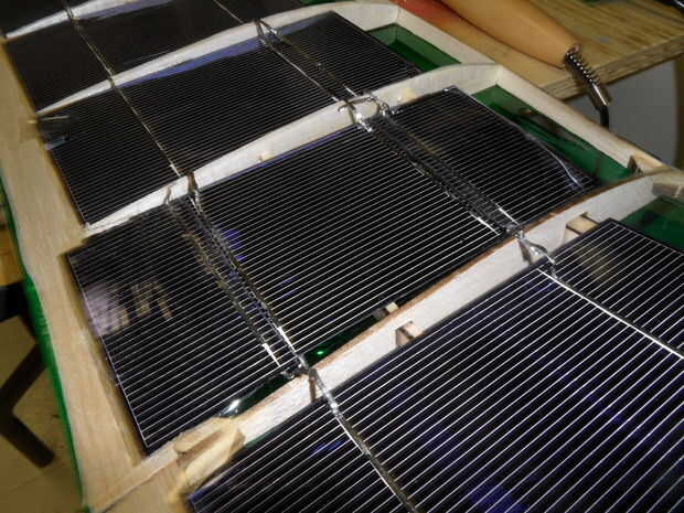 Después de tabular las células, CA se pegarlos en el ala entre las costillas. Después de hacerlo, luego conectarlos en serie cuidadosamente con el soldador, asegurándose de no lastimarse.