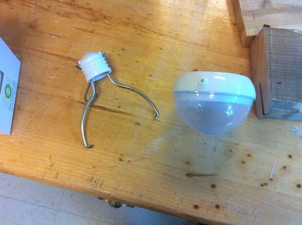 Compra dos solar powered luces. Usé dos bombillas colgando que tenía 4 LEDs en cada uno. Una vez tienes tu marca listo de luces donde el portalámparas de la sombra se va y taladre dos orificios ligeramente más pequeños que el diámetro del bulbo igual distancia se. Mis bulbos que sobresale a ambos lados para un soporte de piezas de plástico, utiliza las extensiones mi bulbos podrían estar al ras con la sombra. Usé una lima redonda para traer abajo el tamaño y la profundidad.