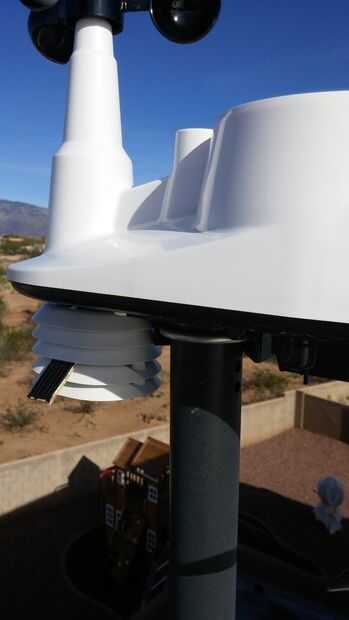 Debido a la forma el la estación Vantage Vue se monta a su polo, el sol iluminará una célula solar y el sol iluminará el otro. Al mediodía la estación cortina de células solares, pero el sensor de temperatura y radiación escudo están también en pantalla en ese momento, por lo que no importa mucho.