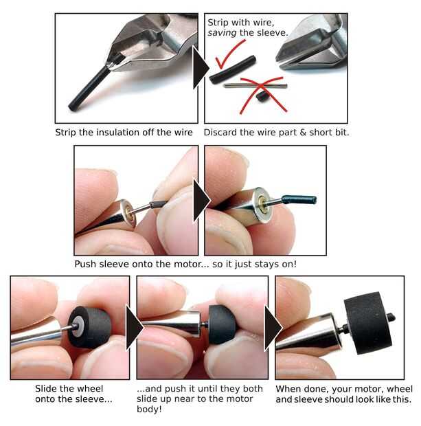Usted probablemente ha notado que el interior hueco de la rueda de goma es demasiado grande en comparación con el eje del motor. Tomar un trozo de manga del aislamiento del alambre e inserte el eje, que crea un calce con la rueda de goma.