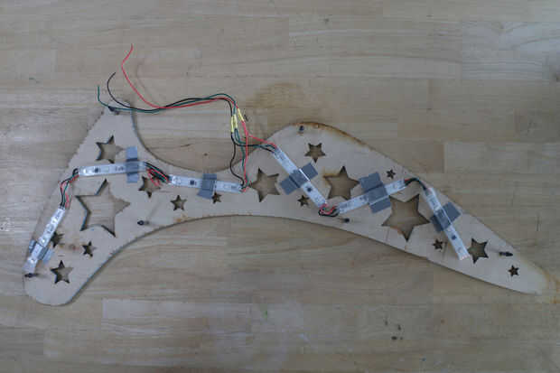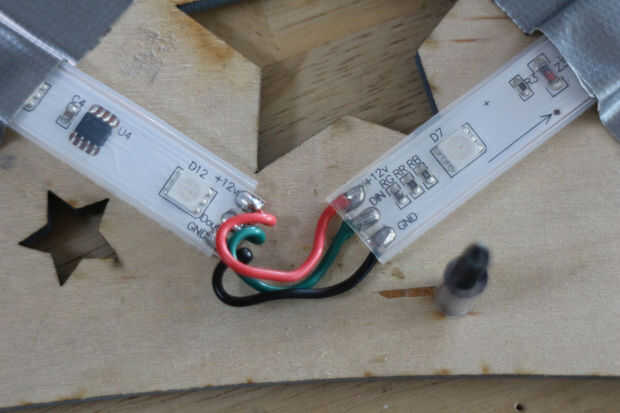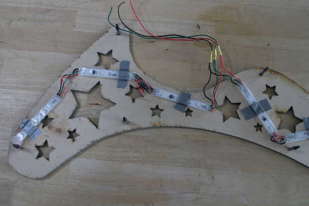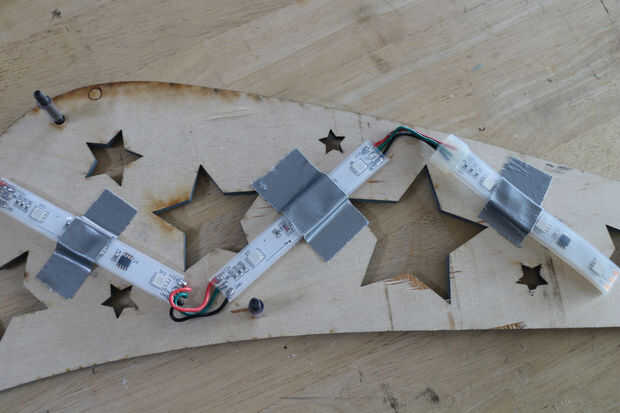 Picado algunas del tricolor tira de LED en pequeñas secciones. La tira de LED de Radioshack es realmente fácil de trabajar porque hay claras líneas de corte y soldadura uniones y las flechas direccionales que indican cómo utilizar su producto.