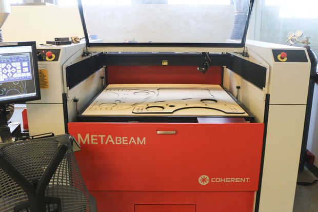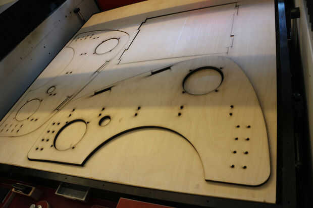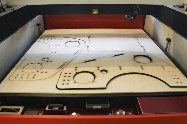 Aquí en el muelle tenemos acceso a algunas herramientas super rad. Usé el METABeam 48" cortador del Laser para cortar los 3 paneles que he diseñado en Adobe Illustrator. Había utilizado madera contrachapada de 1/2" para las 3 piezas principales que formarían el cuerpo de este trailer.