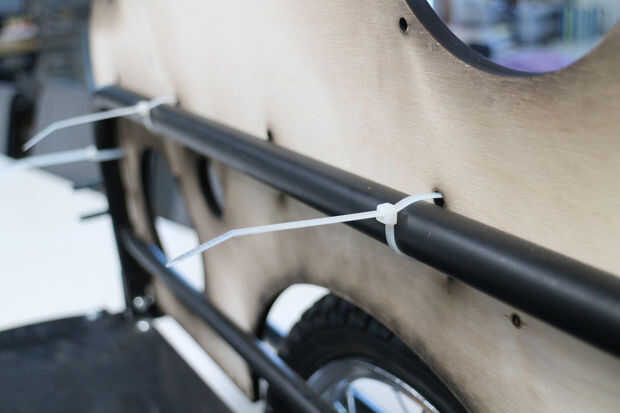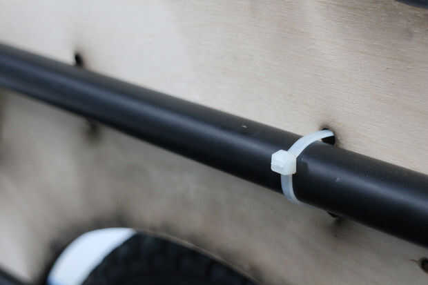 Ajuste los lazos zip a las barras de remolque y luego había cortado los extremos. Me di cuenta de que iba a tener que cortar las barras de remolque de media para hacer espacio para los altavoces.